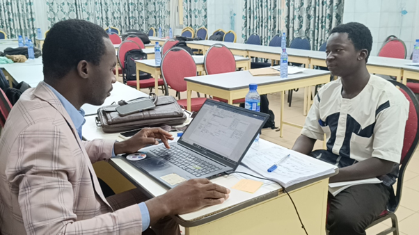 Wahyoussao Ouédraogo (droite) échange avec le formateur sur ses projets.